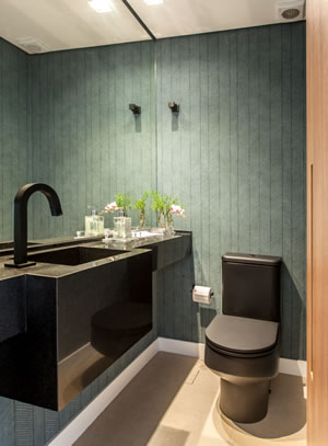 As paredes se destacam sobre o papel de parede texturizado verde musgo que reveste as paredes. Foto: Eduardo Pozella