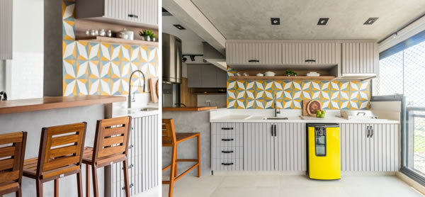 Na varanda gourmet executada pelo arquiteto Bruno Moraes, o ladrilho hidráulico com a estampa que recorda um ‘que’ de retrô. Caracterizado por sua porosidade, o que torna sua instalação mais desafiadora em comparação ao azulejo, o escritório realizou um planejamento cuidadoso da paginação para garantir um resultado estético harmonioso | Foto: Guilherme Pucci