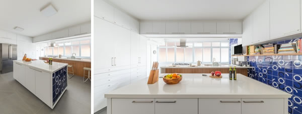 Na cozinha predominantemente branca, o arquiteto Bruno Moraes elegeu o revestimento que homenageia o renomado designer Athos Bulcão, cujas obras são amplamente reconhecidas em Brasília, local onde o proprietário desse imóvel trabalhou e viveu por muitos anos. Na execução do projeto, ele acompanhou, cuidadosamente, da paginação do azulejo que foi aplicado não apenas na parede da cozinha, como também a face da ilha central | Foto: Guilherme Pucci