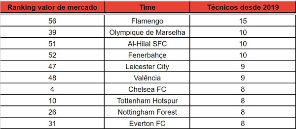 A pesquisa considerou os 60 clubes com elenco mais valioso, de acordo com o site especializado Transfermarkt (entre eles, apenas dois brasileiros, Flamengo e Palmeiras). Todos os técnicos destes times desde 2019 foram registrados, inclusive interinos, e o rubro-negro aparece com 'vantagem' de cinco treinadores em relação a três equipes que vêm a seguir na lista: o francês Olympique de Marselha, o saudita Al-Hilal e o turco Fenerbahçe. Abaixo, veja o top-10 em número de técnicos nos últimos cinco anos.