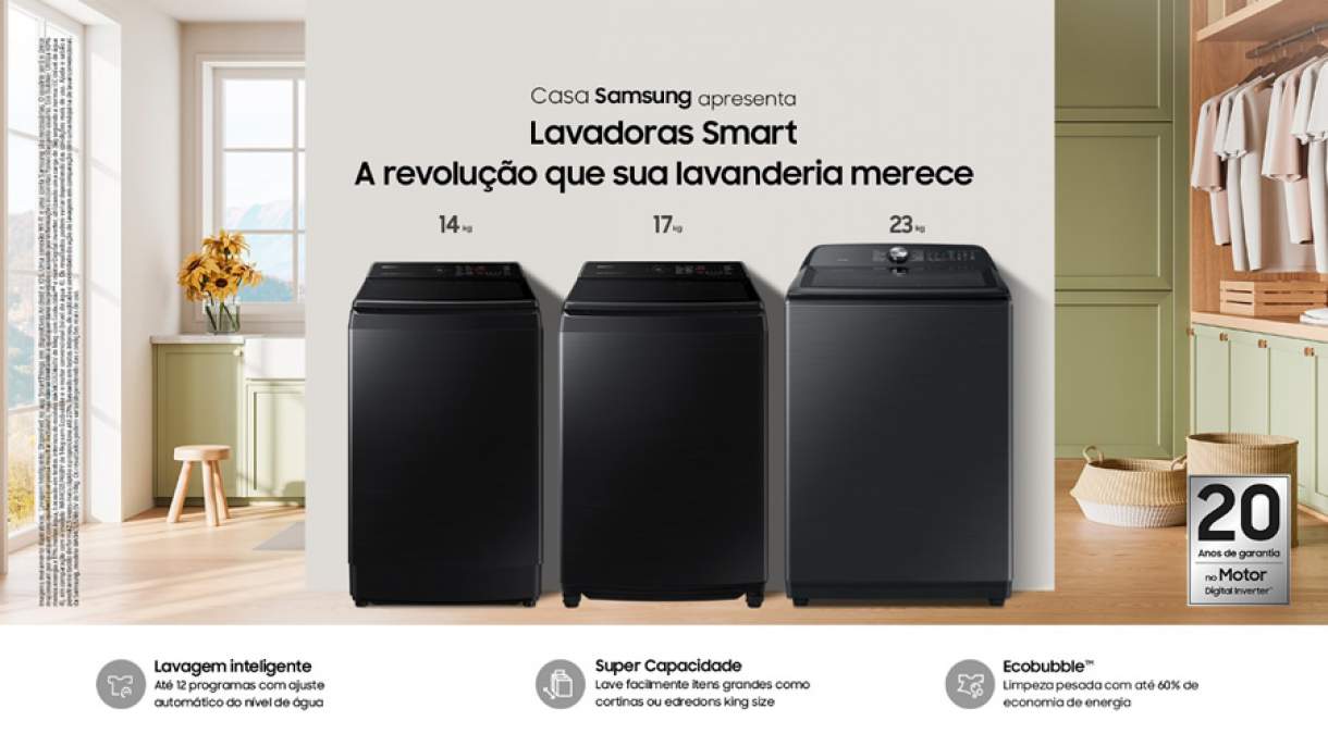 A Samsung lança no Brasil três novos modelos de lavadoras de abertura superior (top load), ampliando seu portfólio de soluções em lavanderia. As novas máquinas, WA14CG (14kg), WA17CG (17kg) e WA23B (23kg), oferecem aos consumidores uma revolução na lavandeira brasileira, combinando alta capacidade e funcionalidades inéditas na categoria, trazendo praticidade e inovação para o dia a dia. Com a chegada desses modelos, a Samsung passa a contar com um portfólio completo de lavadoras, incluindo opções de abertura frontal (Front Load), Verticais e agora, abertura superior - Top Load, reafirmando seu compromisso em oferecer produtos que atendem às diversas necessidades dos lares brasileiros.