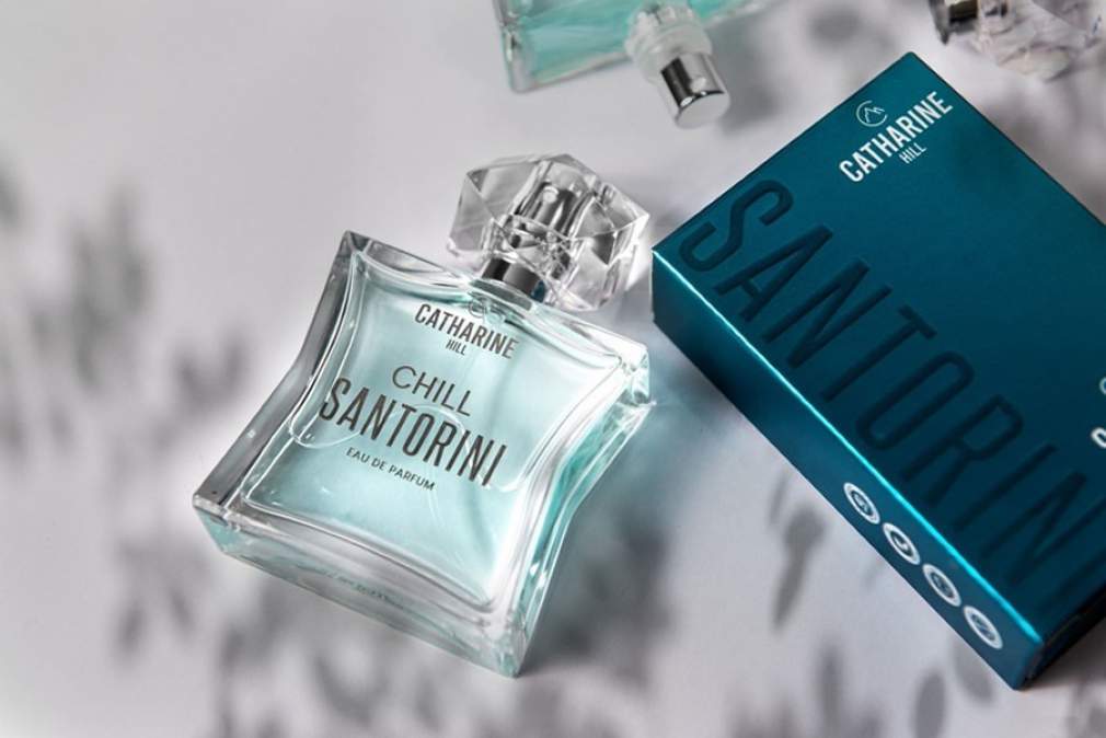 O Chill Santorini Eau de Parfum é inspirado na ilha grega de Santorini e apresenta uma formulação equilibrada com notas florais delicadas, incluindo rosa, jasmim, lírio do vale, orquídea e gerânio. A fragrância busca refletir as águas cristalinas do Mar Egeu, em harmonia com a identidade visual da Catharine Hill, na cor azul.