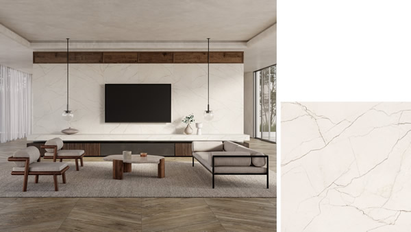 O porcelanato que retrata a suavidade dos mármores claros pode marcar presença em diversos ambientes dos projetos residenciais, como salas de estar e jantar, onde adiciona as percepções de amplitude e luminosidade, bem como cozinhas e banheiros, tornando-se uma escolha perfeita pelo seu viés refinado – sem contar a continuidade de sua aplicação nas bancadas e cubas esculpidas.