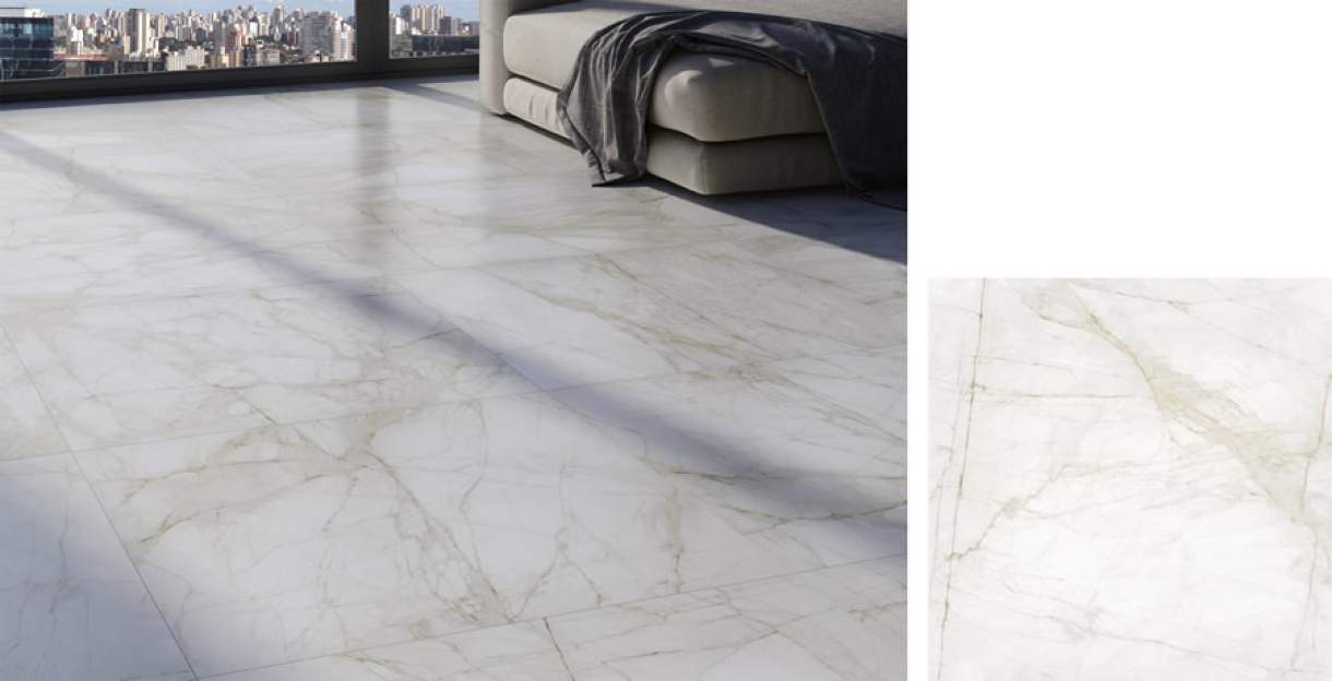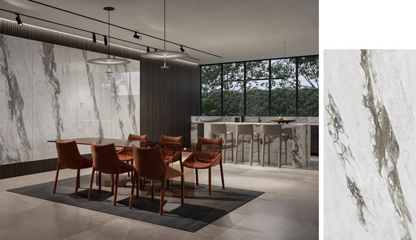 Ideal para ambientes internos secos em aplicações convencionais e também em bancadas, tampos ou painéis, Gran Calacata, da Roca Cerámica, apresenta detalhes em carving, que ressaltam os desenhos e trazem pontos de luz em baixo relevo e superfície mate. Já a versão Micro Crystal, com a aplicação de uma camada cristalina de esmalte, enaltece seu brilho intenso e a profundidade dos veios que se tornam muito mais vivos e densos.