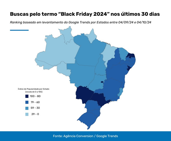 Segundo um estudo recente realizado pela Agência Conversion, utilizando dados do Google Trends, entre 4 de setembro e 4 de outubro de 2024, foi possível identificar os estados que mais pesquisaram sobre a Black Friday. Até o início de outubro, 488 mil buscas mensais pelo termo "Black Friday" foram registradas ao longo dos últimos 12 meses.