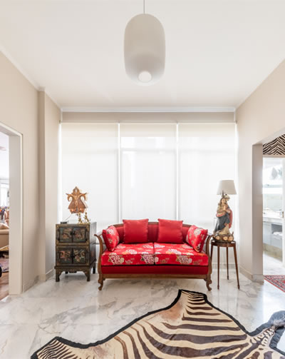 Uma entrada bem planejada reflete organização e estilo: bonito e organizado, passa uma imagem positiva. Por outro lado, uma visão oposta é capaz de transmitir a percepção de uma vida caótica porta adentro. Nesse apartamento antigo, datado da década de 1960, a decoração ousada e autêntica valorizou o acervo dos moradores | Projeto BMA Studio | Foto: Guilherme Pucci
