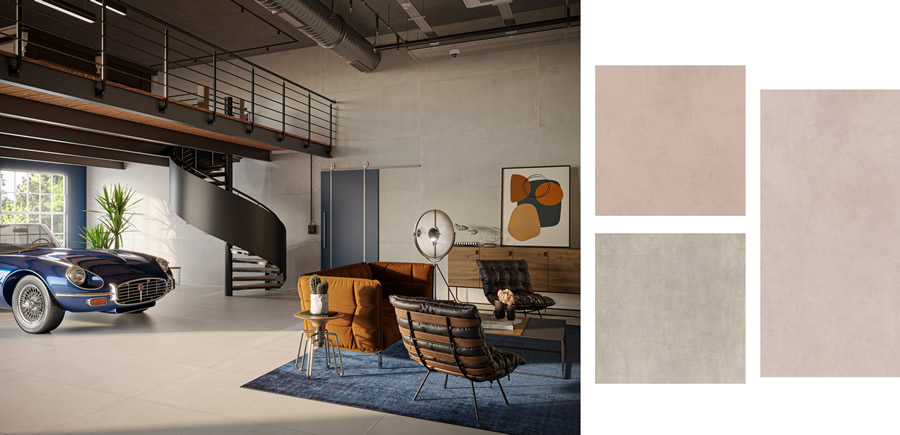 Nos lofts industriais ou em projetos arquitetônicos mais ousados, o pé-direito elevado abre oportunidades para o uso de revestimentos diferenciados e esteticamente singulares, como a série Concrete, que busca ressignificar o concreto aparente. As lâminas são apresentadas em versões mate e Micro Crystal em 120 x 120 cm ou 120 x 250 cm e nos tons Greige, Gray e Off-White | Foto: Divulgação Roca Cerámica
