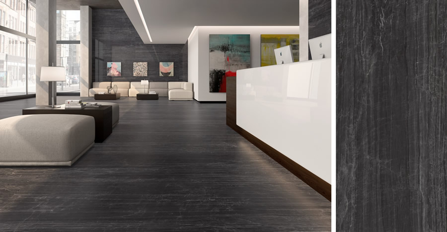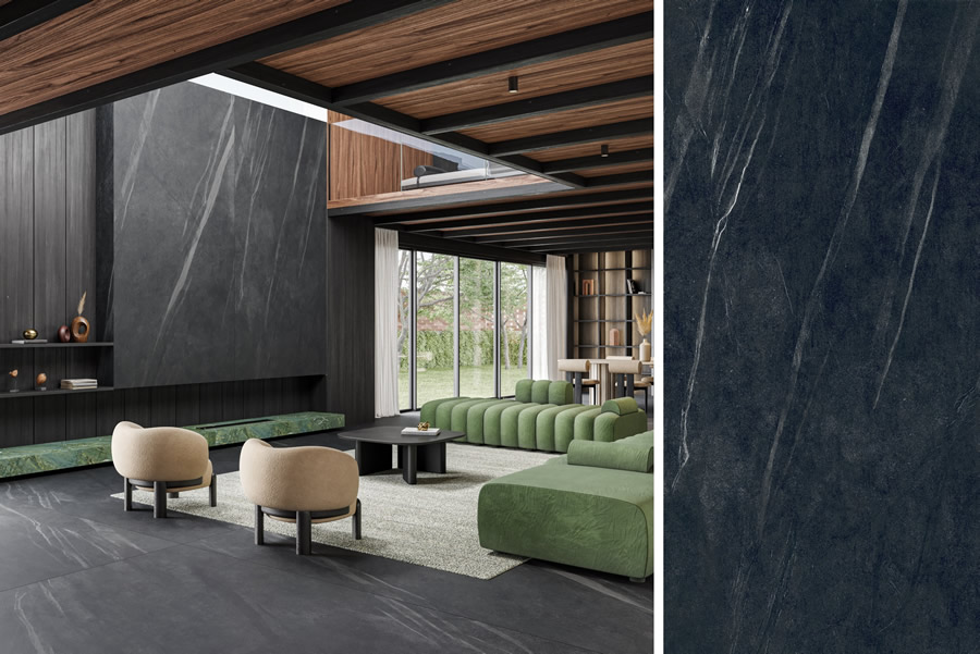 A Série Infinity no formato inovador de 160 x 320 cm, surpreende pela escala impactante e os suaves veios transversais sobre um fundo preto absoluto. A alta performance do Superformato permite sua instalação todas as áreas internas, em pisos e paredes, além de atender aos projetos de movelaria, como bancadas, tampos e painéis | Foto: Divulgação Roca Cerámica