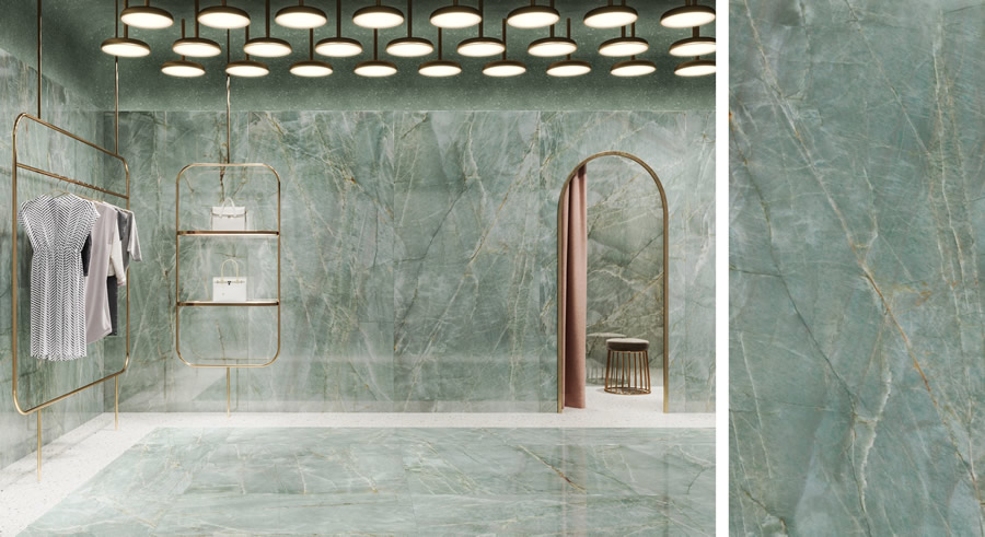 Termo exclusivo da construção civil brasileira, o pé-direito na sua versão mais comprida tem o poder de impactar diretamente no conforto térmico e acústico do ambiente, já que o calor e o som se dissipam mais facilmente para o teto. Na imagem, o Superformato da série Alpi, inspirado no exótico mármore verde encontrado na Itália, é encontrado no formato de 120 x 250 cm e nos acabamentos mate e Micro Crystal | Foto: Divulgação Roca Cerámica