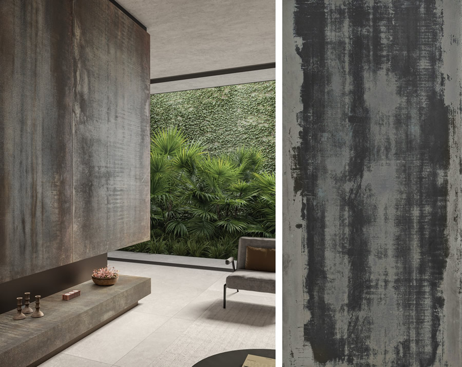 A Série Fusion transpõe, de forma sublime, a textura do metal sobre as lâminas no Superformato 120 x250 cm. Como uma chapa de aço em tom grafite e leves marcas de oxidação, a tecnologia Mineral LAB concede um efeito único com a fusão de minerais nobres aplicados milimetricamente sobre a estampa cerâmica | Foto: Divulgação Roca Cerámica