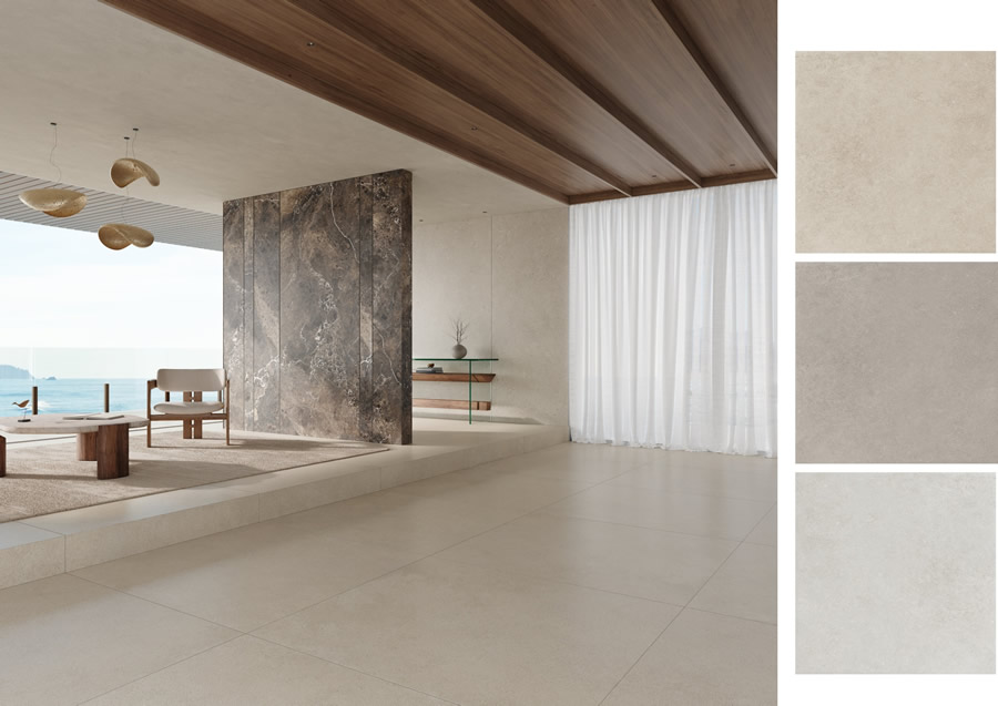 A série Limestone, que reproduz a rocha originária da Turquia e da Espanha, vem ganhando cada vez mais destaque nos projetos de arquitetura pela versatilidade de uso. Com variações de tons, os Superformatos estão disponíveis nos formatos 120 x 120 cm e 120 x 250 cm | Foto: Divulgação Roca Cerámica