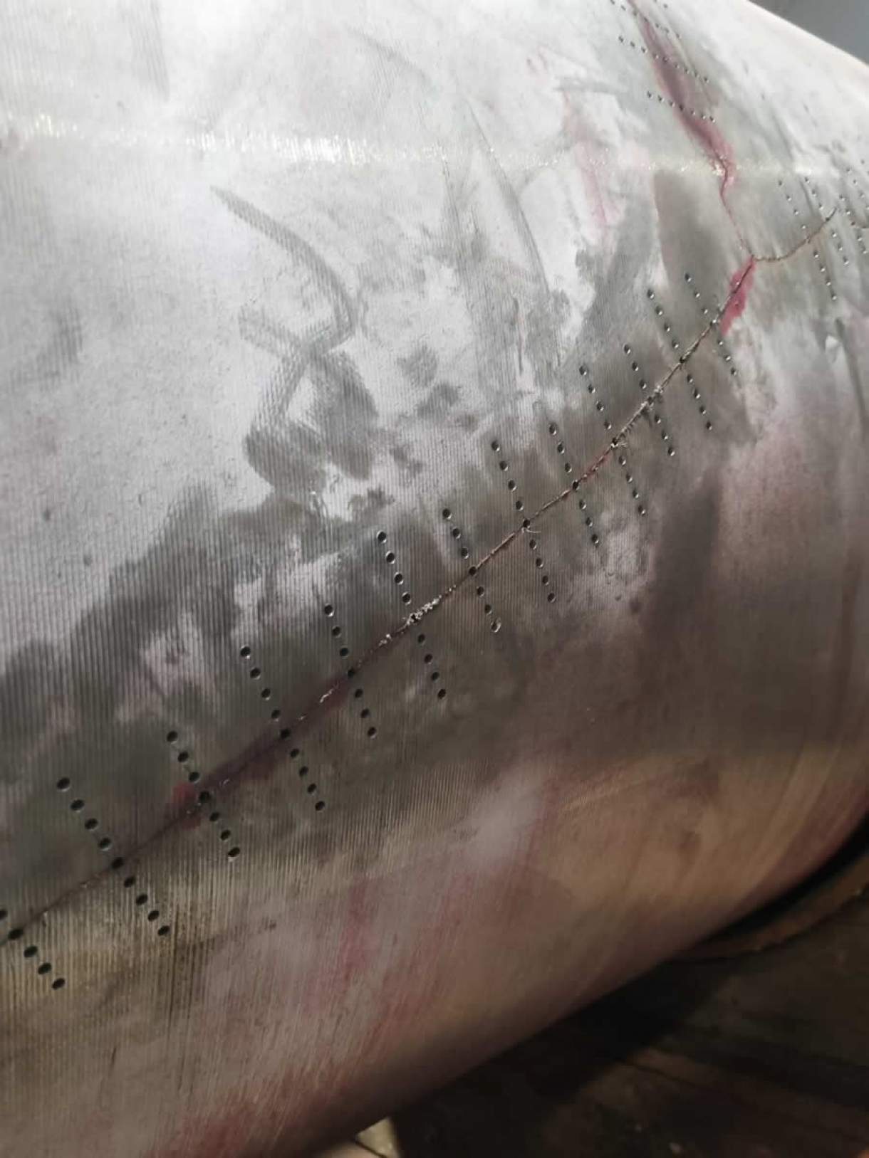 Após inspeção por ensaio de líquidos penetrantes (LP), foram identificadas trincas significativas no corpo do rolo, exigindo reparo imediato para evitar a propagação dos danos.