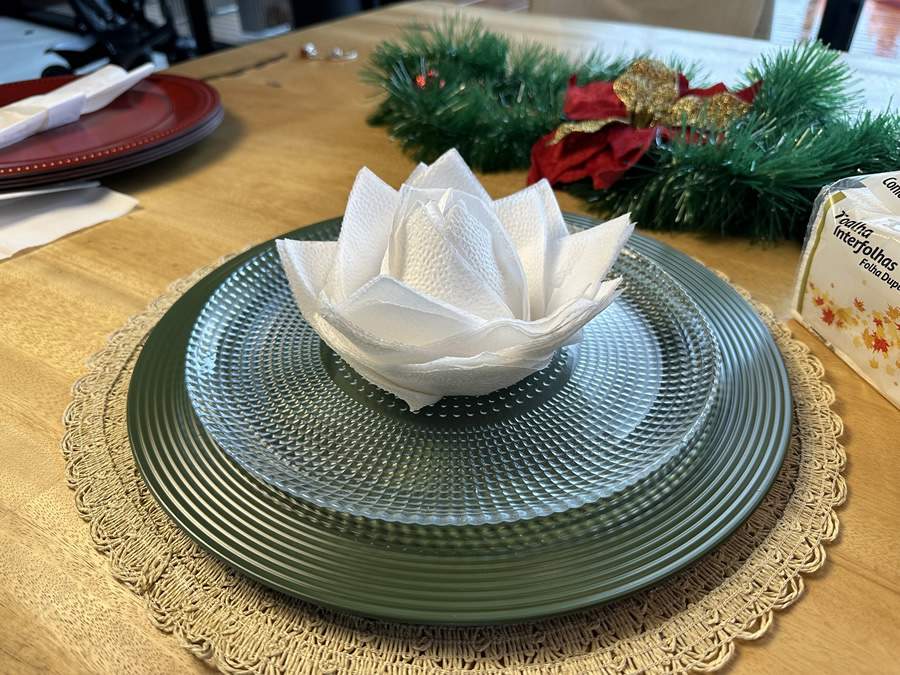 O guardanapo de papel, que até pouco tempo tinha apenas atributos funcionais, vem se tornando uma estratégia de decoração e encantamento. Além de ser um item versátil e econômico, existem inúmeras maneiras de dobrá-lo para elevar a experiência visual e tornar a mesa posta da ceia natalina ainda mais especial.