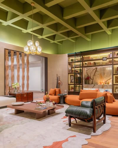 No ambiente da CASACOR 2024 assinado pelo arquiteto Bruno Moraes, o verde está presente em diversos elementos do projeto, como na icônica Poltrona Mole, de Sérgio Rodrigues, na escada verde, no forro, na mesa de apoio. A cor vinha simbolizando parte herança cultural brasileira | Projeto BMA Studio | Foto: Guilherme Pucci e Vitor Guilherme