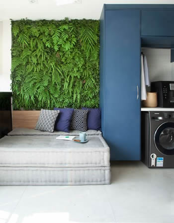 Em um cantinho da varanda, o arquiteto Bruno Moraes realizou um jardim vertical de plantas preservadas para compor com o futon | Projeto BMA Studio | Foto: Luis Gomes
