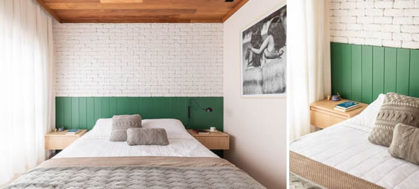 Na suíte principal deste projeto executado pelo arquiteto Bruno Moraes, a madeira de demolição em cumaru, presente no piso e no forro, entregam um clima rústico na sintonia com a cabeceira verde e a parede de tijolinhos | Projeto BMA Studio | Foto: Guilherme Pucci