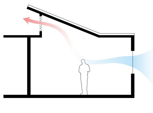 Na ilustração, é possível observar a troca de ar. O ar frio, que é mais pesado, desce, enquanto o ar quente sobe e é eliminado por aberturas mais altas, conferindo conforto térmico | Imagem: Divulgação Rawi Arquitetura