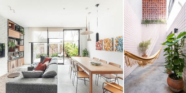 No projeto Casa Alegre, do escritório Rawi Arquitetura + Design, a inclusão de cobogós no muro de divisa (foto 1) com o terreno ao lado auxiliou a entrada de ar fresco para o quintal e, consequentemente, para dentro da casa. Além disso, o ar que passa pelo caixilho, encontra o átrio no lado oposto da área social (foto 2), promovendo a troca de ar | Fotos: Juliana Deeke