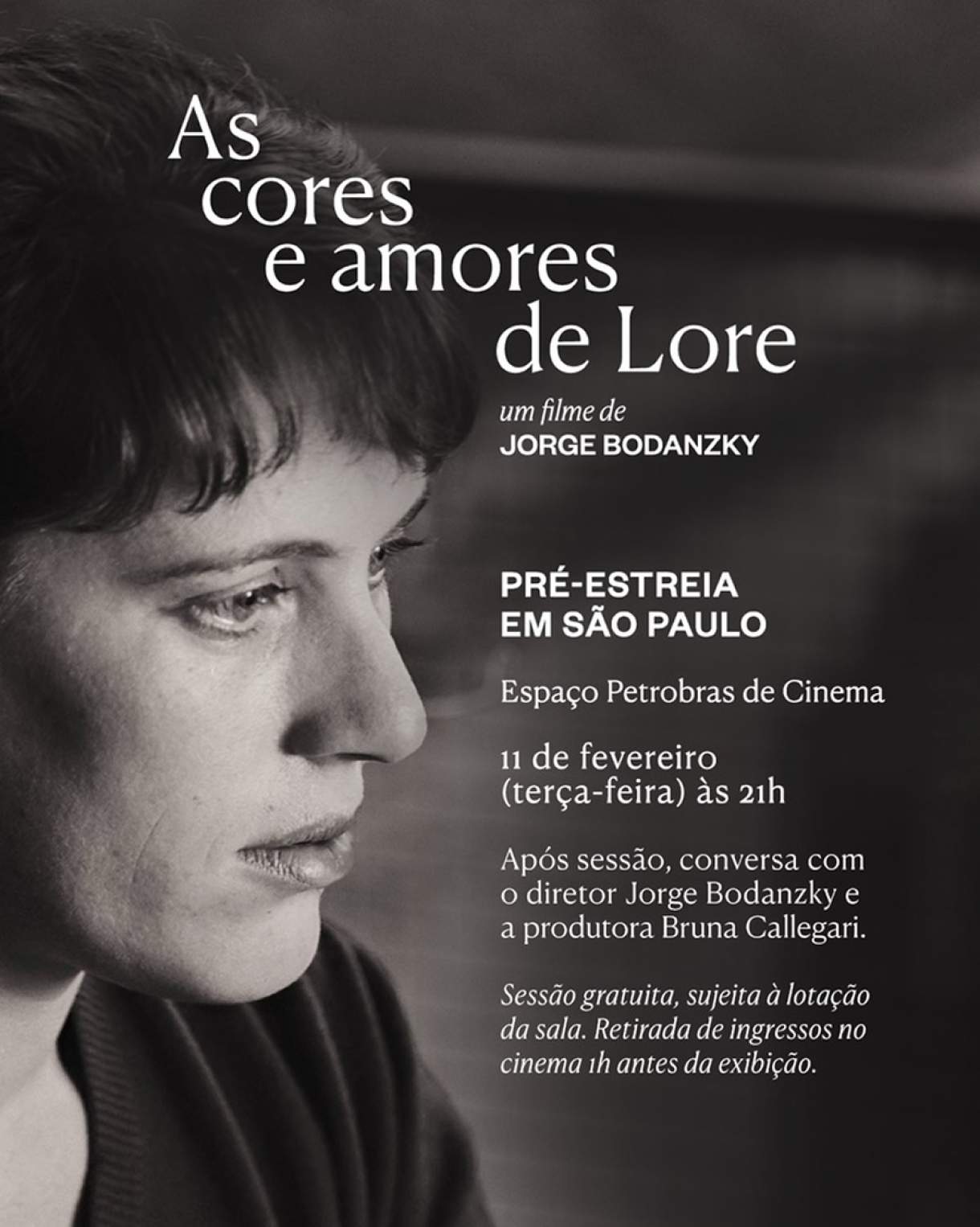 AS CORES E AMORES DE LORE, novo filme dirigido pelo cineasta Jorge Bodanzky, ganha uma pré estreia especial gratuita em São Paulo, no dia 11/02 (terça-feira), às 21h, no Espaço Petrobras de Cinema (Rua Augusta, 1475), com participação do próprio diretor e da produtora e montadora Bruna Callegari. Ingressos devem ser retirados diretamente no cinema uma hora antes da sessão.