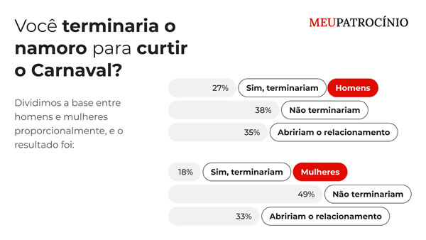 No levantamento feito pela plataforma, os entrevistados responderam à seguinte pergunta: “Você terminaria o namoro para curtir o Carnaval?” Entre as alternativas de resposta, “Sim”, “Não” e “Abriria o relacionamento”.