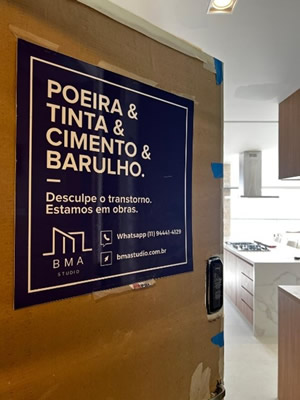Contribuindo para a política de boa vizinhança, o escritório posiciona uma plaquinha bem humorada para avisar os moradores sobre a ocorrência de obras no local. Também há a possibilidade de deixar uma cestinha aos vizinhos com um bilhete e um mimo para aqueles dias de obras pesadas | Obra BMA Studio | Foto: Divulgação