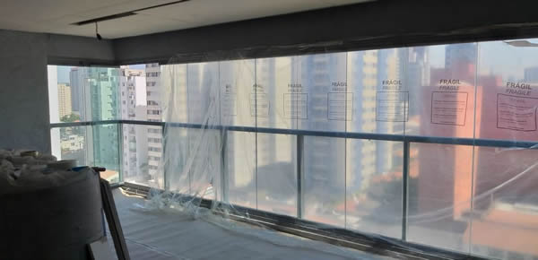Em obras de instalação do piso da varanda é necessário fechar o ambiente com uma manta de proteção até o teto ou tapumar, quando permitido, como meio de proteção do local contra a poeira, ventos e chuva, quando está sem o fechamento de vidro | Obra BMA Studio | Foto: Divulgação