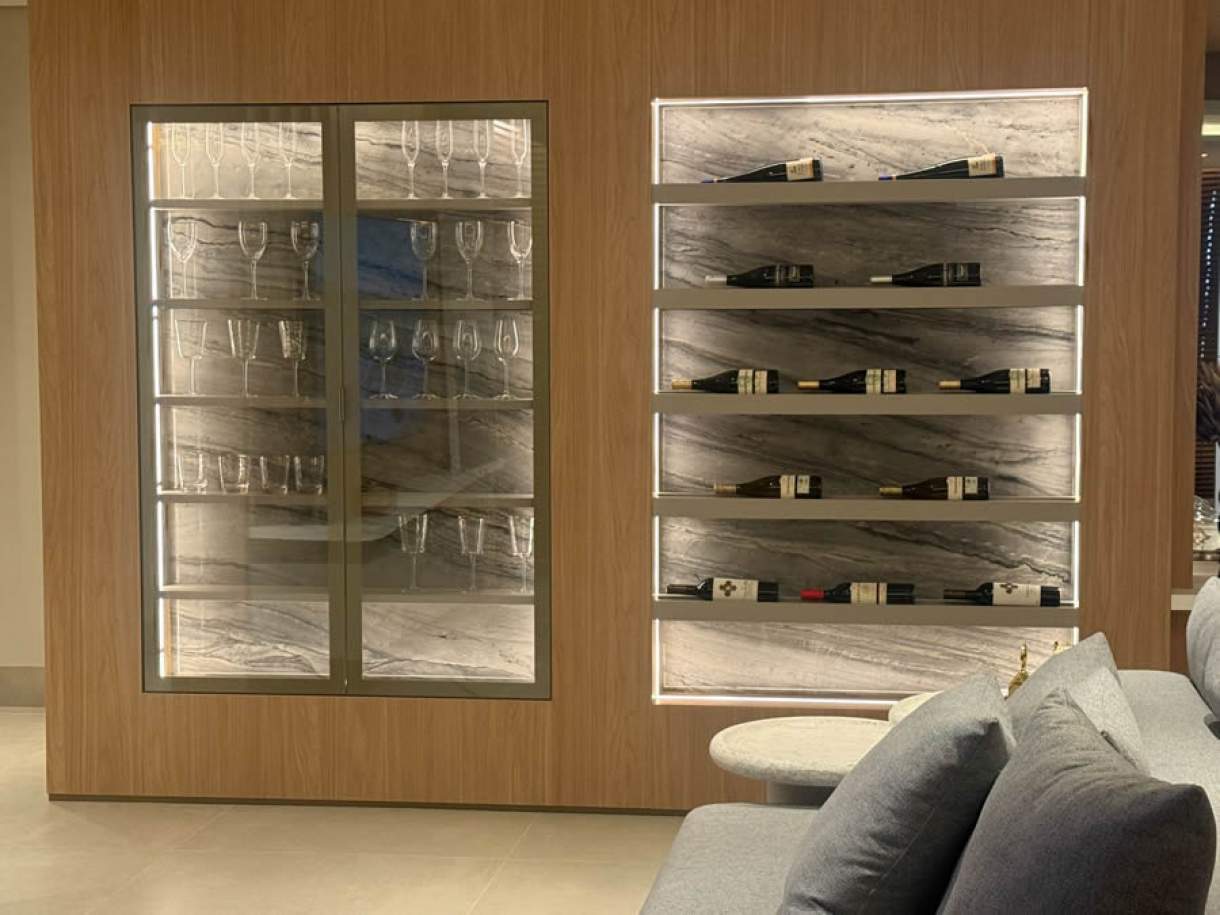 Um exemplo prático de cristaleira e adega moderna, planejada para se adaptar ao projeto do apartamento foi projetada por Luísa no apartamento decorado do residencial Parque El Retiro, da Euro Incorporações, na Avenida PL 2, no Park Lozandes, em Goiânia. No local, a arquiteta inseriu na ampla e integrada sala de estar um modelo de cristaleira e adega embutidas em um painel, formando um nicho. O móvel acompanha o design requintado, clean e minimalista do apartamento, por isso ela optou por usar a marcenaria em tons claros e mesclar com revestimento de pedra polaris no fundo e iluminação interna em led e externa indireta, para dar destaque à peça, porém de forma harmoniosa. O apartamento modelo está disponível para visitação do público. Por ser um móvel planejado, a arquiteta explica que o local e o tamanho das peças varia de acordo com o gosto de cada proprietário.