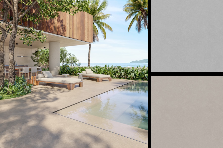 Surpreendendo nas áreas externas, a Série Solid, da Incepa, traz o efeito do cimento para o porcelanato em dois acabamentos: polido e acetinado. Seus tons neutros permitem um espaço ideal para relaxar e a prática de meditação e atividades, como alongamento e yoga. Com o SuperFormato 120x120 cm, opção versátil para todo tipo de ambiente, o material traz os tons Concret e Sand para o seu portfólio | Fotos: Divulgação Incepa