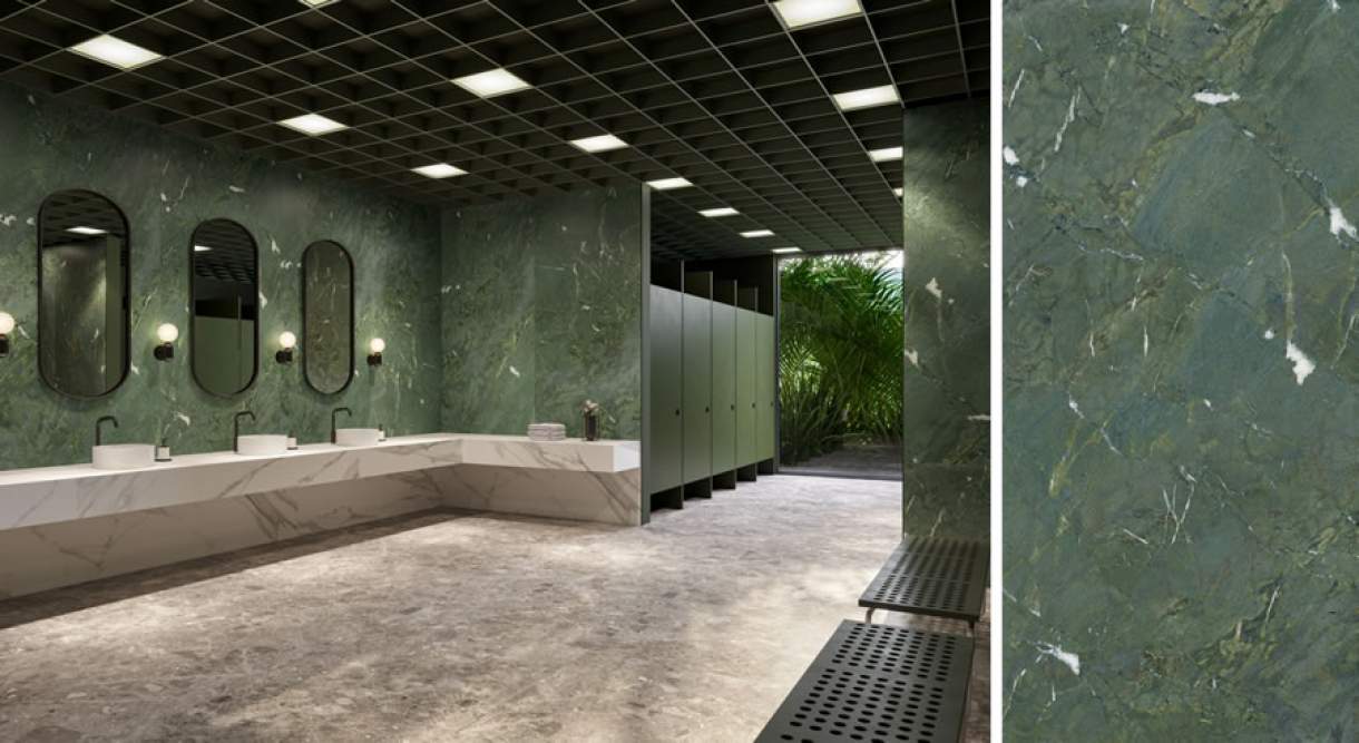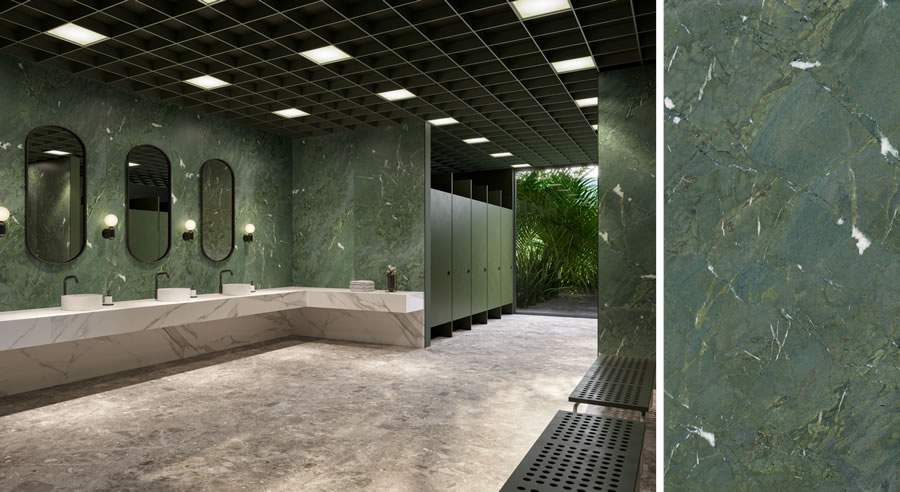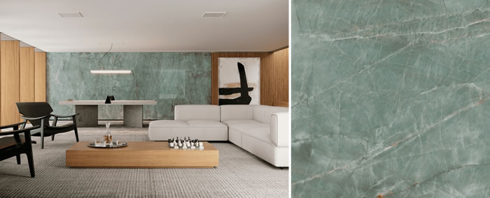 O Mármore Verde Alpi é uma rocha encontrada na região da Itália. De um verde intenso e uniforme, apresenta veios brancos marcantes que contrastam com o fundo. É um dos mármores mais raros encontrados na natureza. Os porcelanatos no formato 120 x 250 cm são inspirados na pedra e reproduzem todas as nuances e variações de desenho. As lâminas são apresentadas nas versões mate (com toque acetinado) e Micro Crystal (com brilho intenso).