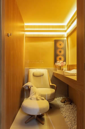 Na cabine de amamentação do Banheiro Raiz, a luz quente, em tom amarelado, favorece o relaxamento do bebê e da mamãe | Projeto da arquiteta Janaína Casagrande para a CASACOR São Paulo 2025 | Foto: Maura Mello