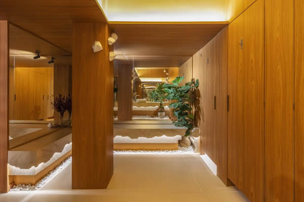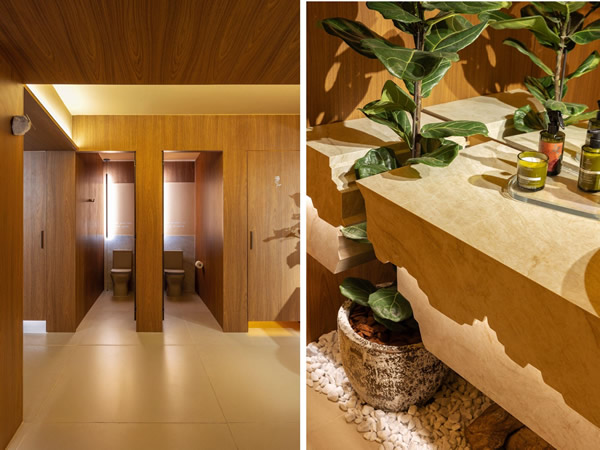No Banheiro Raiz, essa atenção aparece em todos os detalhes. A iluminação indireta e difusa, por fitas de LED, compõe com o revestimento das quatro cabines, vigas e pilares em MDF Freijó, transmitindo a sensação de calor e acolhimento. Sob a bancada com duas cubas de apoio e o banco, executado em lâmina sinterizada de mármore com acabamento que reproduz fielmente a estética do quartzito Taj Mahal – extraído no Ceará e de padronagem nobre e elegante –, ela direciona o fluxo ao mesmo tempo em que exalta as imperfeições do corte irregular das barras, que fazem referência às imperfeições que presenciamos em nós e na natureza.