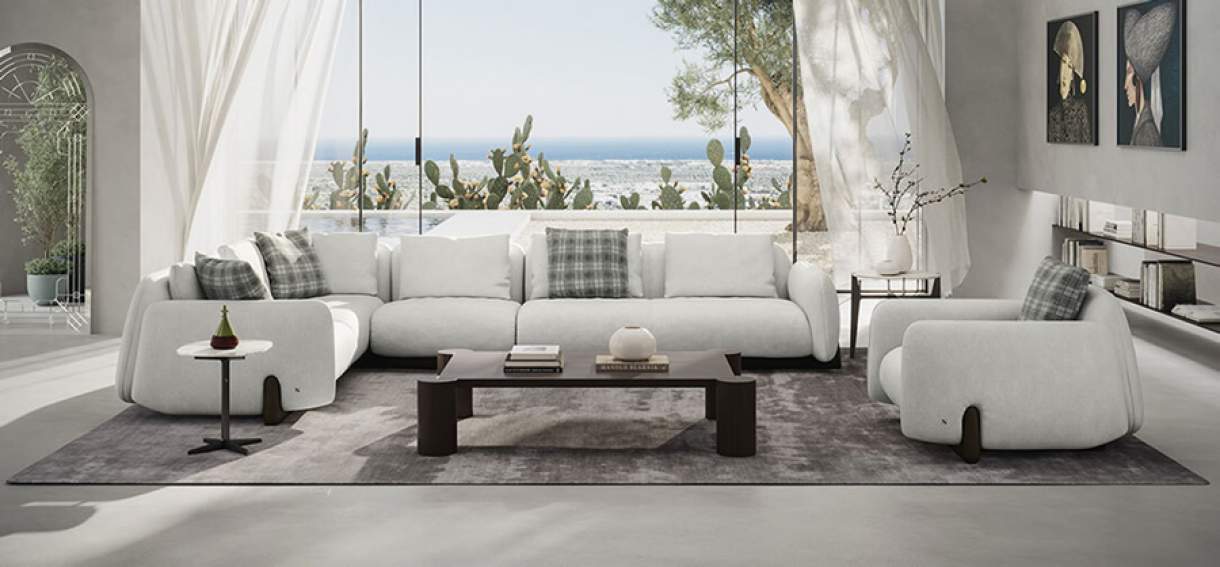 Inspirado na arquitetura da Apúlia, no sul da Itália, o sofá une tradição e modernidade em formas contemporâneas. Sua estrutura apresenta personalidade marcante, combinando profundidade arquitetônica e suavidade, valorizando o espaço e o conforto.