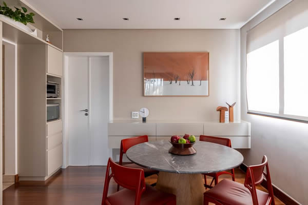 Associada também à energia, na sala de almoço o arquiteto Raphael Wittmann elegeu o vermelho para as cadeiras da sala de almoço | Projeto Rawi Arquitetura + Design| Foto: Rafael Renzo