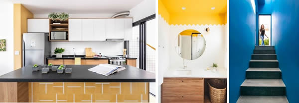 Na mesma residência, o perfil dos moradores permitiu com que o arquiteto Raphael Wittmann pudesse brincar com as cores: o amarelo que predomina no ladrilho hidráulico escolhido para a bancada e o piso da cozinha; a parede salmão no lavabo; o teto amarelo do banheiro e o azul royal eleito para o corredor que acompanha a escada de acesso ao piso superior da edificação | Projeto Rawi Arquitetura + Design | Fotos Juliana Deeke