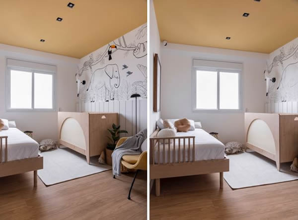 Nesse projeto, o arquiteto Raphael Wittmann optou por incorporar a pintura do teto como parte da decoração, sendo uma maneira eficaz de criar um espaço encantador e funcional para o bebê. O resultado foi uma experiência visual rica e um ambiente convidativo | Foto: Rafael Renzo