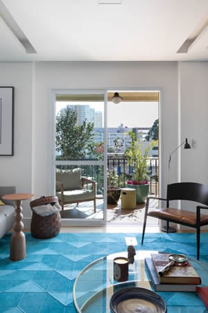 A liberdade de inserir cores: neste apartamento, a base predominante clara permitiu ao arquiteto Raphael Wittmann conceder ao tapete a ‘responsabilidade’ de colorir a sala de estar | Projeto Rawi Arquitetura + Design | Foto: Alexandre Dizaro