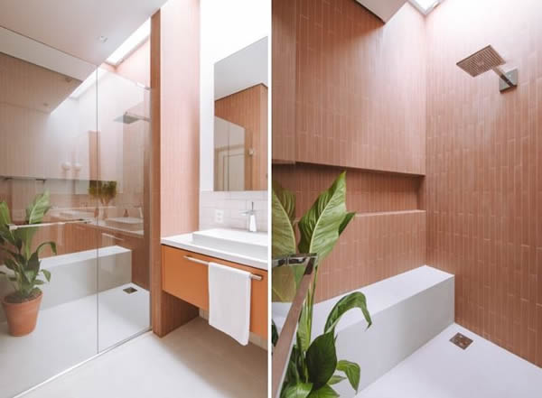 Os tons vibrantes do laranja, despertam o ânimo, ao passo que também combatem o cansaço e trazem vitalidade. Essa foi a proposta do arquiteto Raphael Wittmann para esse banheiro com uma claraboia no teto | Projeto Rawi Arquitetura + Design | Foto: Juliana Deeke