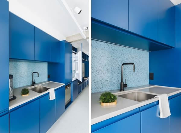 Na cozinha, o azul eleito pelo arquiteto Raphael Wittmann entregou personalidade ao projeto | Projeto Rawi Arquitetura + Design Foto: Juliana Deeke