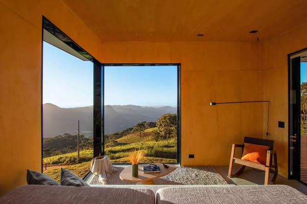 No projeto de interiores que o arquiteto Raphael Wittmann realizou em um chalé localizado no município de São Bento do Sapucaí, na Serra da Mantiqueira (SP), o amarelo que cobre parede e teto contribuiu para a atmosfera rústica da casa e sua vivacidade foi ‘abrandada’ pela paisagem bucólica das montanhas avistadas por meio das generosas esquadrias de vidro | Projeto Rawi Arquitetura + Design | Foto Alberto Ricci