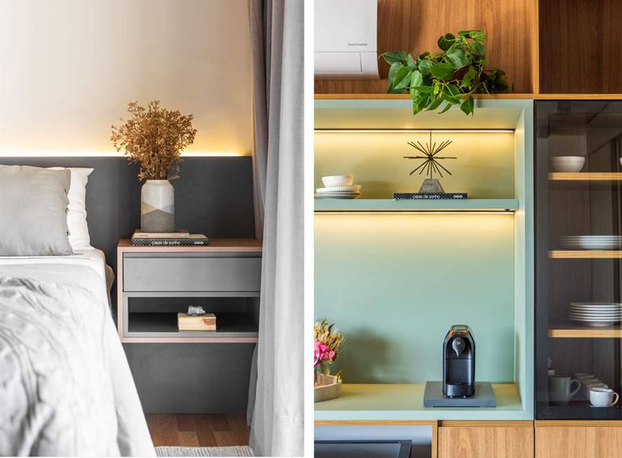 Outro conselho prático é pensar em um circuito de iluminação entre os cômodos da residência. De acordo com o arquiteto, dividir o ambiente em mais de um caminho possibilita acender apenas alguns spots de luz, ao invés de acionar tudo de uma única vez. Além de construir um clima mais aconchegante e criar diferentes cenários para o lar, evita-se que muitas lâmpadas estejam ligadas simultaneamente. “Luminárias com sensor de presença também são boas alternativas para evitar desperdício de energia”, compartilha Bruno.