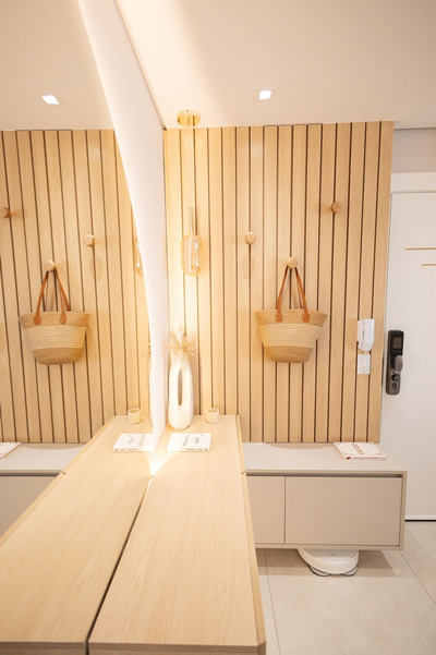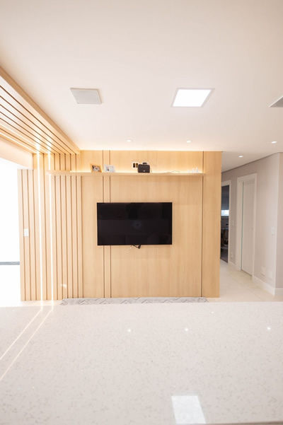 Para os clientes, um visual clean para o apartamento era o ideal. “A combinação entre móveis claros e elementos em madeira foi pensada para criar equilíbrio visual e sensorial no ambiente. Os tons claros trazem leveza e amplitude, enquanto a madeira adiciona acolhimento e conexão com a natureza. Acho que esse contraste é extremamente importante porque ativa diferentes sensações aos moradores: serenidade, foco e aconchego. Na psicoarquitetura, a madeira é um elemento biofílico que contribui para o bem-estar, criando uma atmosfera mais humana e emocionalmente reconfortante”, conclui Luciana Patriarcha.