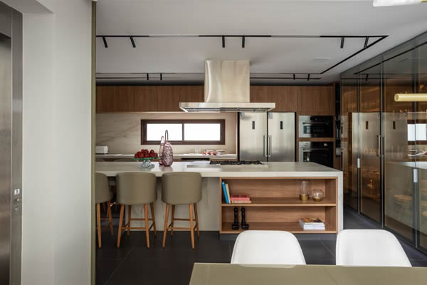 Nesse projeto assinado pelos arquitetos Mariana Meneghisso e Alexandre Pasquotto, a coifa é primordial para que os moradores possam usar a bancada para as refeições | Projeto Meneghisso & Pasquotto Arquitetura | Foto: Divulgação