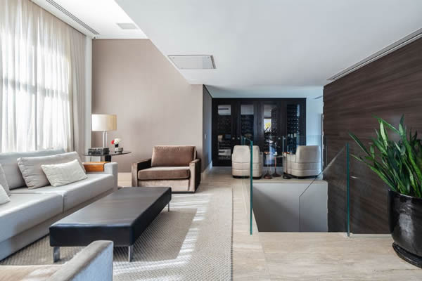 Com dois pavimentos, os moradores têm mais opções para configurar o espaço e fazer salas mais intimistas como desse projeto, um estar de convivência próximo da adega | Projeto de Dantas & Passos Arquitetura | Foto: Maura Mello