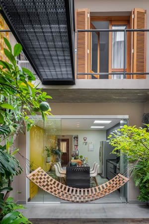 A integração é evidente neste projeto: as banquetas próximas à ilha convidam a família para conversar, além da integração com o quintal da casa, tornando a rotina mais leve e compartilhada | Projeto Atelier Paulo Tripoloni | Foto: Adriano Escanhuela