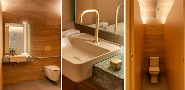 As quatro cabines, incluindo um banheiro acessível e um fraldário, foram executados com a aplicação do MDF rosê nas portas e divisórias, uma escolha que reforça a paleta afetiva e aconchegante. A marcenaria sob medida garante leveza visual, mantendo a proposta de um refúgio contemporâneo e inclusivo.