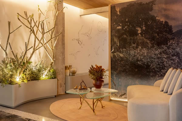 Completando a área de estar, concebida para ser um ponto de descanso e admiração, o mobiliário assinado por designers nacionais reforça o caráter autoral e sustentável do projeto: as linhas curvas do sofá off-white (7Oito9 Design), de Richard Daniel, convida à permanência e estabelece um diálogo interessante com a forma escultural da mesa de centro orgânica desenhada pela arquiteta Fernanda Marques (Breton).