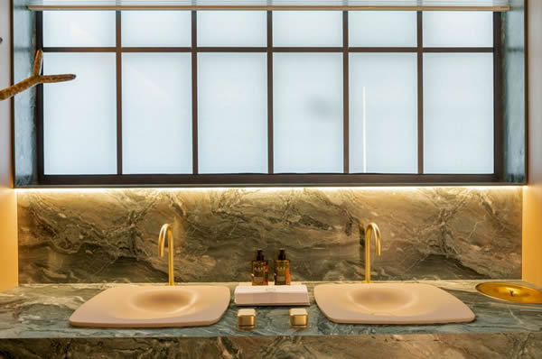 Na bancada, dois lavatórios repousam sobre uma superfície escultural: a nova resina da Fórmica, modelo Paladina Green, é uma prévia inédita da coleção Matizes, destinada para áreas molhadas e que também foi aplicada para revestir o banco. O projeto luminotécnico é percebido através das luzes indiretas e cênicas, com fitas de LED, que alternam a dimerização para entregar atmosferas envolventes.