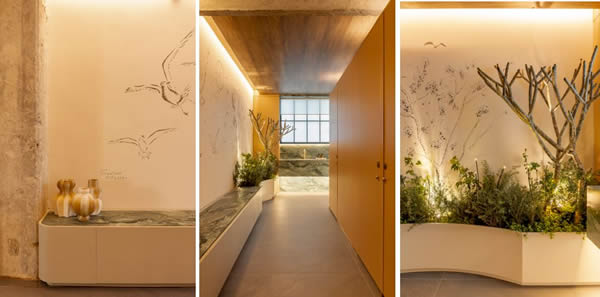 Entre o jardim formatado por floreiras galvanizadas para expor as flores de jasmim, associada ao amor verdadeiro, a parede principal se tornou uma tela em branco que foi preenchida pelo artista Gustavo Maciel, que usa uma talhadeira para desenhar a superfície de concreto. Em destaque, mais uma analogia sobre o casal com a apresentação de uma revoada de pássaros voando com sua plena autonomia. “Esse painel traduz com sensibilidade o espírito do nosso ambiente ao evocar as ideias de liberdade e movimento. E são justamente os dois primeiros, que se sobressaem em um primeiro plano, que se tocam e complementam como as forças yin e yang. Essa correlação representa o nosso vínculo como casal e dupla dinâmica à frente do escritório”, comenta Alexandre Pasquotto.