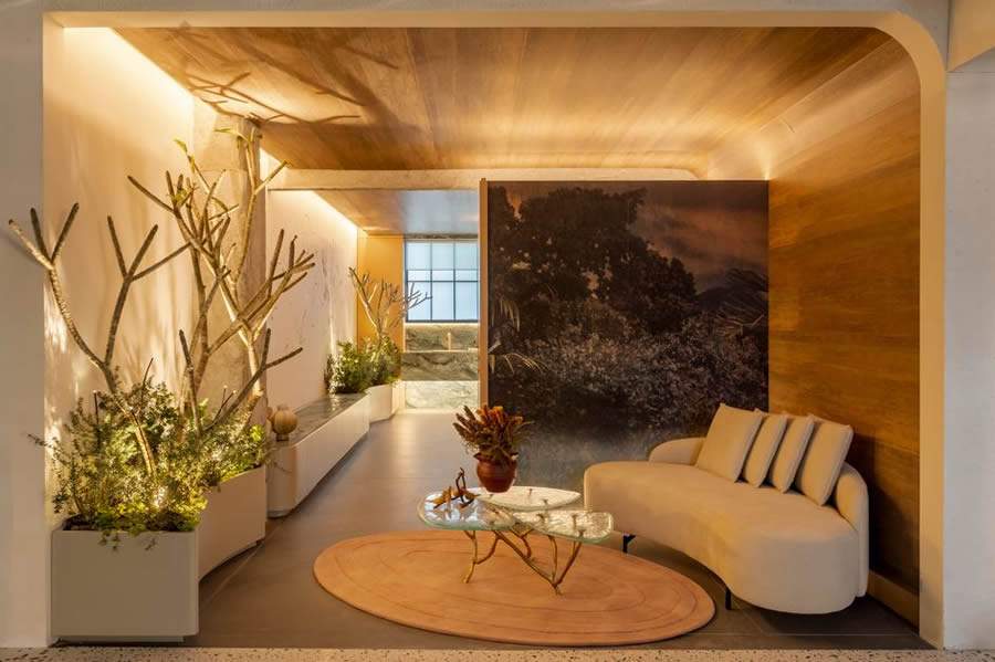 Com 27 m², o Natureza em Essência foi concebido como um santuário particular que difunde sensações, equilibra os contrastes e que deseja mostrar ao público a importância de reatar alguns vínculos que foram perdidos e que são primordiais à nossa existência. Entretanto, para que cada um estabeleça o processo de ouvir sua voz interior, é preciso haver sintonia entre nossos corpos físico e mental. “Não há compreensão se não nos permitirmos ao silêncio que acessa nossos sentidos”, verbaliza Mariana.