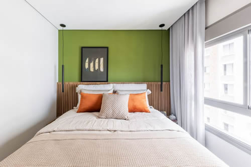 O verde claro contribui para a sensação de amplitude em espaços compactos. Segundo o arquiteto Bruno Moraes, a técnica é muito aplicada em imóveis localizados em áreas urbanas | Projeto BMA Studio | Foto: Guilherme Pucci